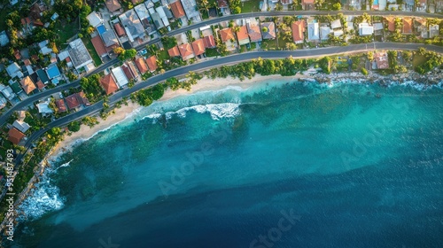 A bird's-eye view of a town by the ocean, with houses lined up along the coast and the deep blue sea in the background.