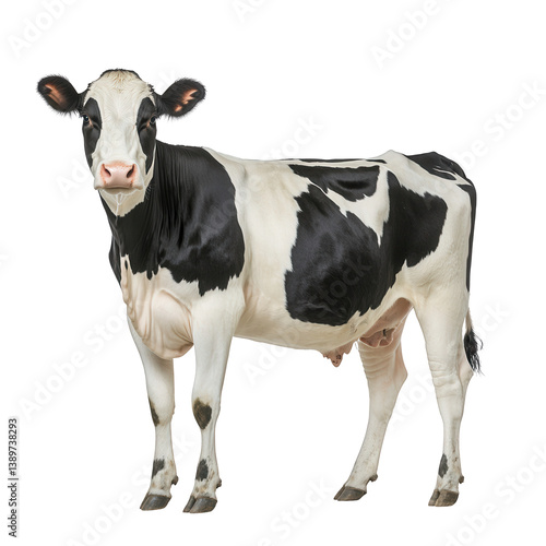 A black and white dairy cow stands proudly, showcasing its unique markings against a white isolated background.