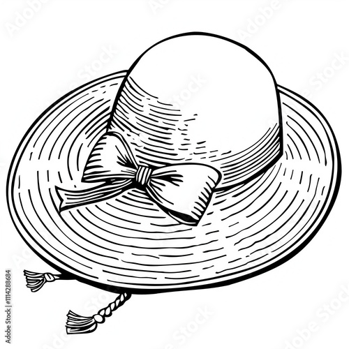 sunhat, hat, rimmed, bow, ribbon, black, white, illustration, drawing, fashion, accessory, summer, vintage, style, classic, elegant, simple, minimalist, design, art, graphic, vector, graphic, graphic design, outline, line art, monochrome, shading, black-and-white
