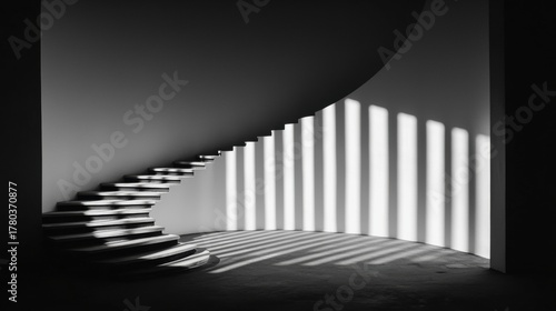 staircase, wall, black, white, scene, curved, interior, spiral, multiple, step, stark, contrast, floor, viewer, eye, pattern, light, depth, dimension, low, angle, height, curvature, spiral staircase, right side, low angle