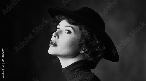 A black and white portrait depicts a woman wearing a black hat, posed against a black backdrop.
