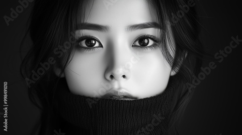 A black and white portrait of an Asian woman with long hair, big eyes, wearing eyeliner makeup