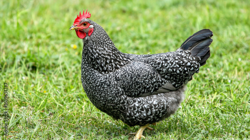 A black and white speckled chicken standing on a grassy field with a blurred background.