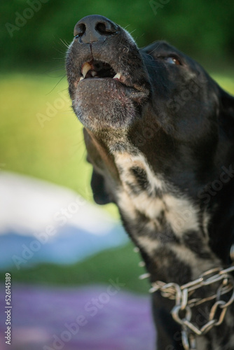 A black angry labrador in a metal collar is tied to a tree in the park.