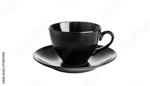 A Black empty coffee cup placed on a saucer. isolated on transparent background.