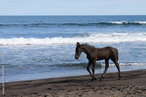 A black foal walks on the black volcanic sand on the Khalaktyrsky beach of the Pacific Ocean. Kamchatka. High quality photo