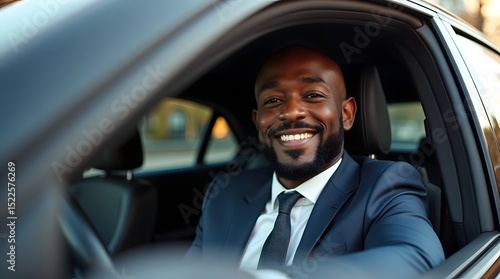 A Black man in a suit smiles brightly from the driver's seat of a car, exuding confidence and professionalism.