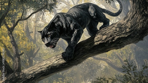A Black Panther Crawling Down from a Tree in a Dynamic Pouncing Pose, Showcasing Impressive Animal Anatomy and 3D Perspective, Capturing the Power and Agility of the Predator.