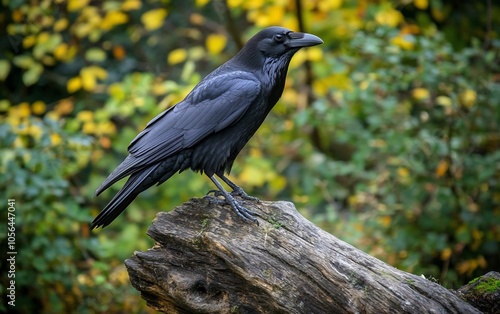 A black raven perched on a log in a forest, with a blurred background of green and yellow foliage.