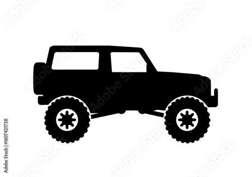 A black silhouette of a four wheel drive vehicle with large tires on a white background