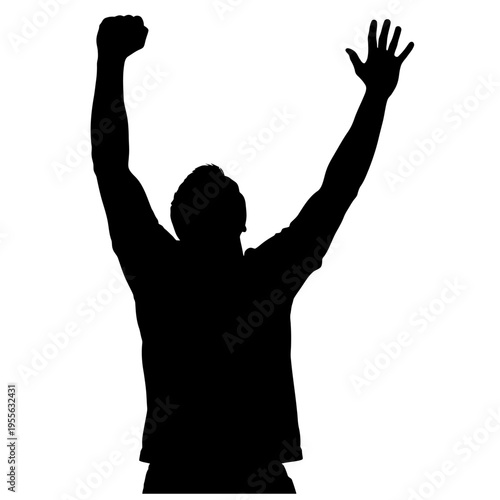 man, silhouette, celebration, victory, success, happy, excited, person, figure, black, symbol, expression, gesture, triumph, joy, elation, arm, raised, fist, palm, up, upward, triumphant, victorious, ecstatic, exuberant, cheerful, jubilant, elated