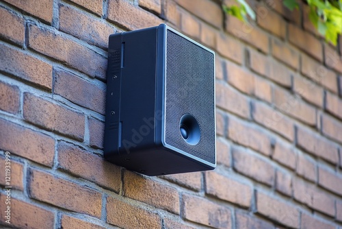 A black speaker mounted on a brick wall
