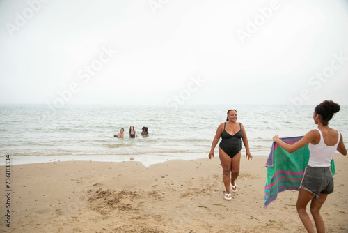 A black woman waking out of the sea smiles at her daughter as she meets her with a towel after swimming.