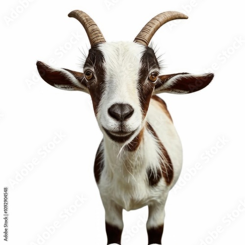 A black-and-white goat stands on a plain white background, showcasing its curved horns. AI generated.