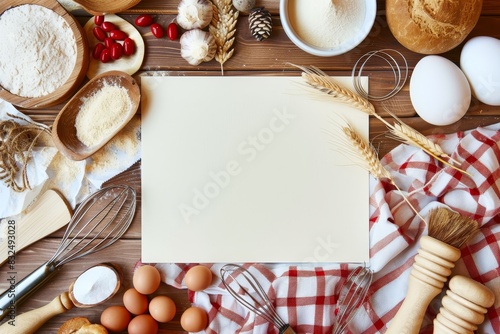 A blank card surrounded by baking ingredients and utensils, perfect for cooking or baking-themed content with a homey kitchen feel.