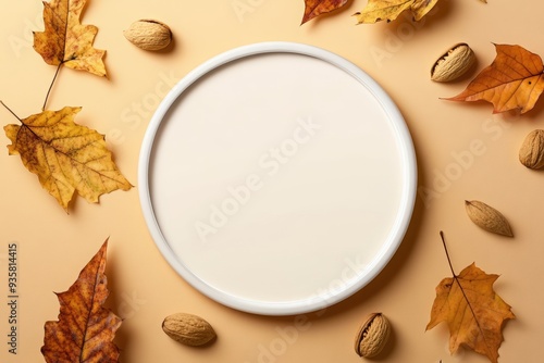 a blank circle on an autumn-themed background with leaves and nuts for text or design. Mock-up template for a menu card or poster design.