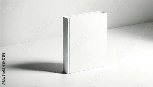 A blank white book is standing upright on a light-colored surface, casting a soft shadow