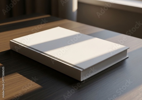 A blank white hardcover book rests on a wooden table bathed in soft window light, casting a shadow