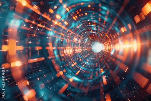 A blue and orange tunnel with lights shining from within
