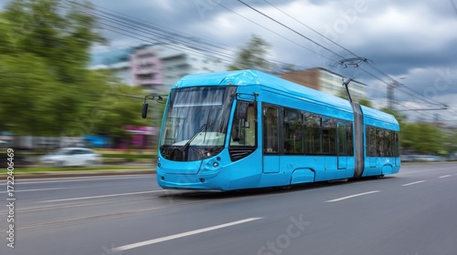 green tree, electricity, electric, public transportation, city landscape, public, city street, city, transportation, urban, building, blue, tram, street, green, tree, building, background