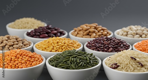 A bountiful collection of various grains, legumes and pulses in white bowls against a gray background, showcasing a diverse assortment of natural food staples