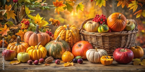 A Bountiful Harvest of Autumn Gourds and Apples Displayed in a Rustic Basket on a Wooden Table