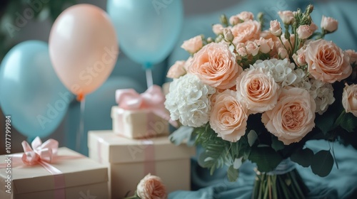 bouquet, rose, flower, hydrangea, gift, celebration, party, birthday, love, romance, floral, arrangement, decoration, present, gift wrap, ribbon, balloon, pink, peach, white, green, background, blue, pastel, soft, delicate, romantic, special, occasion, event, beautiful, elegance, bright, happy, joy, fresh, nature, festive, decor, home, table, design, style