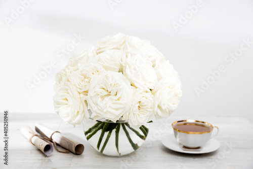 A bouquet of white roses in a round glass vase on a table with a cup of tea and a wrapped rolled paper.
