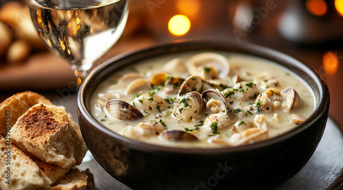a bowl of clam chowder, a wine glass on the side, food photography.
