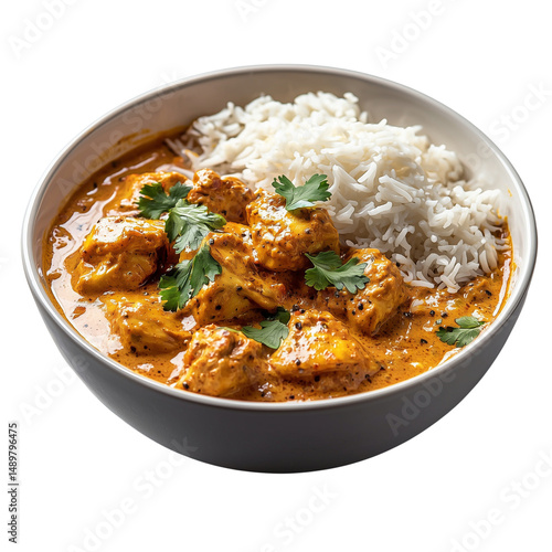 A bowl of flavorful Chicken Korma curry with tender meat pieces and a serving of fluffy rice, garnished with fresh herbs. isolated on white background and transparent background