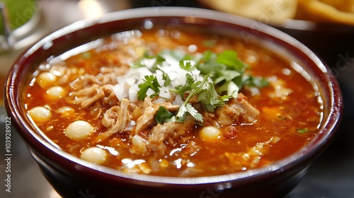 A bowl of Mexican pozole, a hearty soup with hominy, pork, and red chili broth.