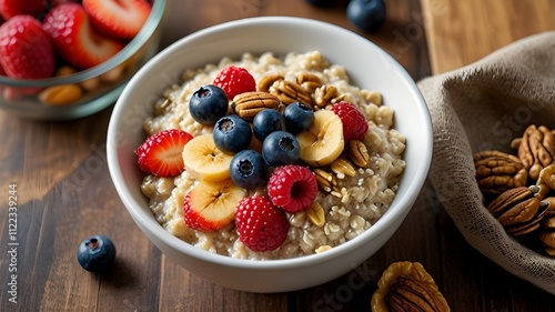 A bowl of oatmeal with honey, nuts, and fresh berries