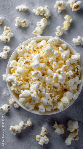 A bowl of popcorn with scattered kernels on a gray surface from an overhead angle close up view food shot