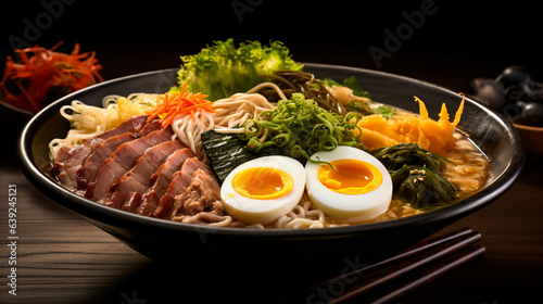 A bowl of ramen with thick soup and noodles