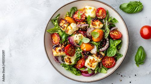 A bowl of salad with grilled halloumi cheese, cherry tomatoes, red onion, basil leaves, and a sprinkle of black pepper.