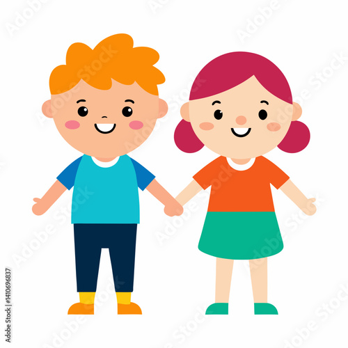 A boy and girl, holding hands and laughing, colorful clothes, white background