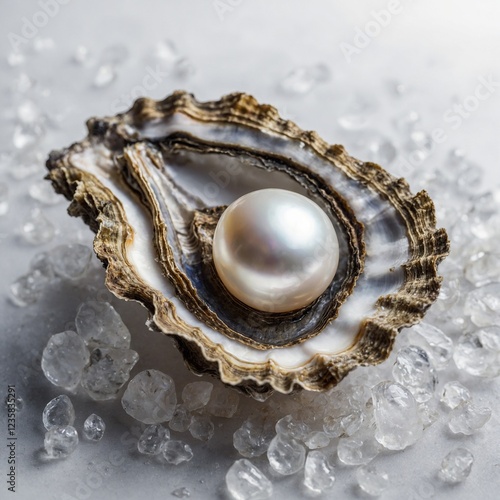 A breathtaking pearl showcased inside an open oyster shell, illuminated by soft sunlight against a crisp white background.