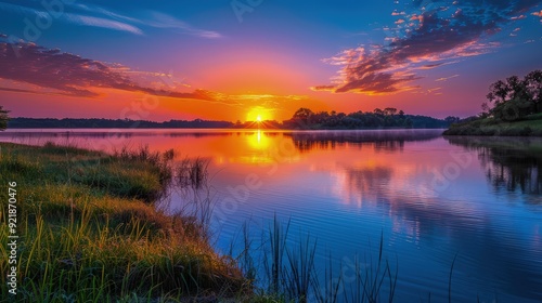 A breathtaking summer sunrise casting vibrant hues over a tranquil lake, with the sky painted in warm colors.