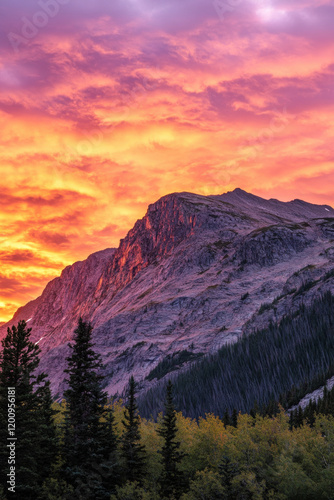 A breathtaking sunset illuminates the rocky mountain peak with vibrant orange and pink hues, surrounded by lush evergreen and deciduous trees.