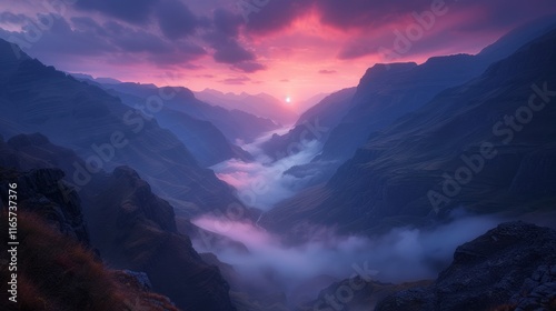 sunset, vale, mountain, mist, cloud, landscape, nature, scenery, twilight, horizon, beauty, peaceful, dramatic, colours, light, shadow, calmness, exploration, adventure, outdoors, environment, sky, terrain, elevation, serenity, vista, panoramic, atmosphere, wilderness, breathtaking, picturesque, journey, calm, dusk, natural, view, depth, silhouette, topography, travel, awe, wonder, majesty