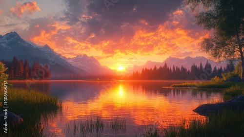 A breathtaking sunset over mountains reflects on a tranquil lake, surrounded by lush trees and vibrant skies, showcasing nature's beauty.