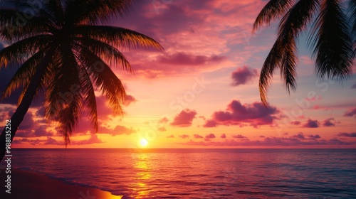 A breathtaking sunset paints the sky in vibrant hues of orange, pink, and purple, casting a warm glow over a tranquil tropical beach fringed with lush palm trees. The silhouette of the palm trees agai