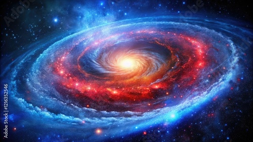 A breathtaking view of a spiral galaxy with vibrant blue and red colors, surrounded by a swarm of stars, universe, galaxy, astronomical phenomenon, starry night