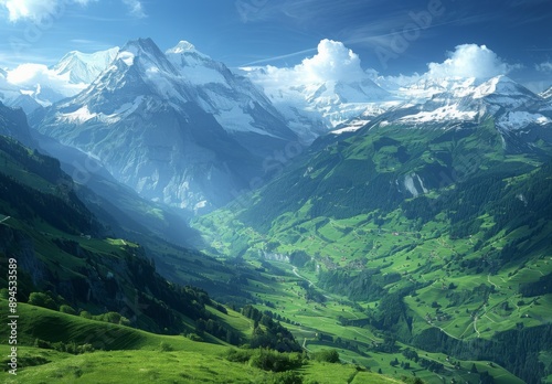 A breathtaking view of snow capped peaks and lush green valleys in the Swiss Alps