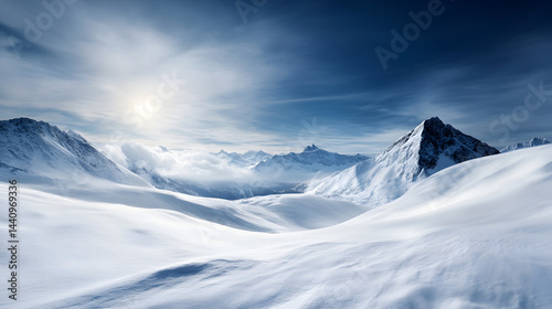A breathtaking view of snow-covered mountain tops under a blue sky, the snow sparkling in the sunlight, creating a picture-perfect winter scene.