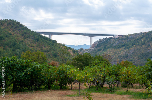 bridge, structure, mountain, forest, sun, cloud, river, travel, nature, architecture, road, water, sky, landscape, suspension, city, suspension bridge, highway, sea, transportation, landmark, bay, transport, mountain, steel, frisco, green, train