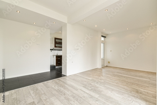 A bright and spacious modern interior featuring clean lines, minimalist decor, and natural light streaming through large windows.