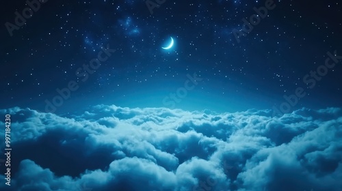 A bright, glowing sky illuminates soft clouds below, creating a serene atmosphere under a starlit night. Concept: Tranquility and wonder.