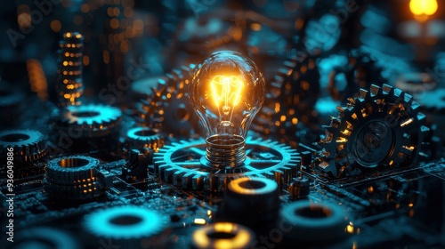 A bright idea concept visualized as a glowing light bulb surrounded by connecting gears and circuits symbolizing innovation, creativity, and the fusion of technology and human ingenuity