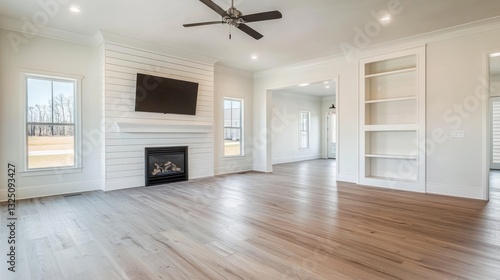 interior, living room, fireplace, window, television, ceiling, fan, light, wall, white, shelf, wood, floor, view, home, house, modern, design, empty, clean, bright, space, open, frame, decor, structure, hardwood, style, architecture, residential, property, finish, plank, detail, construction, elegant, simple, comfort, calm, neutral, trim, panel, paneling, mantel, doorway